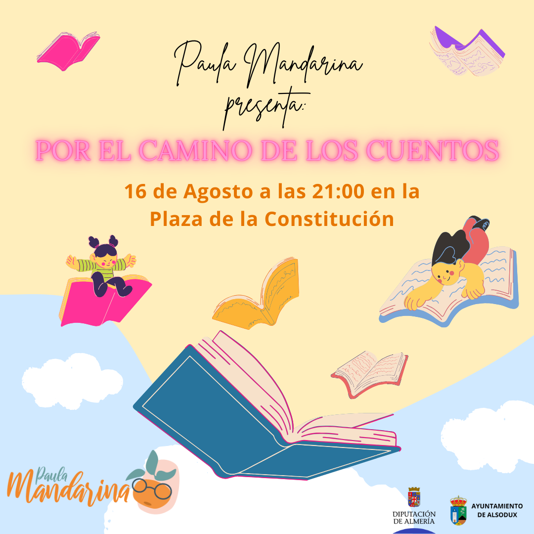 Paula Mandarina presenta: "Por el camino de los cuentos" El Viernes, 16 de agosto a las 21:00 horas en la Plaza de la Constitución ¡Os esperamos para una noche mágica de cuentos y aventuras!