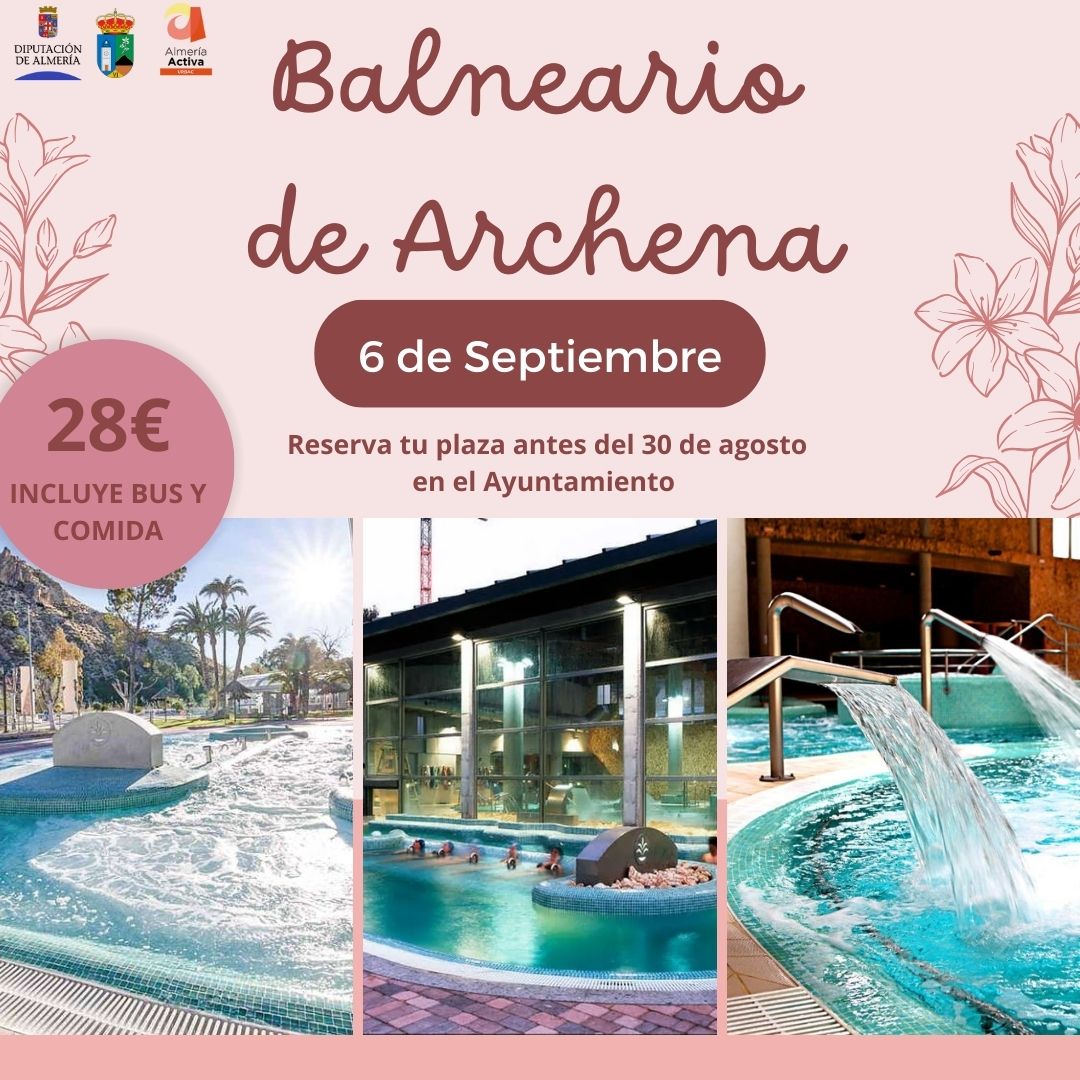 El 6 de septiembre tendrá lugar la excursión al balneario de Archena, por 28€ incluye autobús y comida. IMPORTANTE: inscribirse en el Ayuntamiento antes del 30 de agosto.